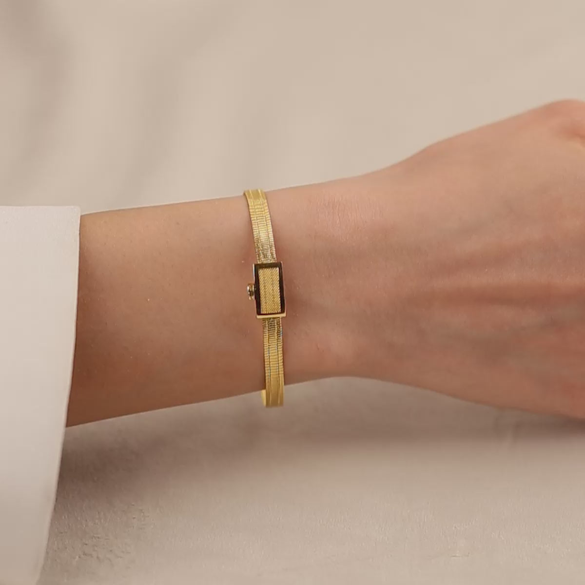 14 ayar altının sıcak sarı tonu, modern düz toka detaylarıyla birleşerek hem klasik hem de modern tarzlara hitap eden nadide bir takıya dönüşür. Elizi’nin yüksek işçilik kalitesi ile üretilen bu bileklik, uzun yıllar değerini koruyacak özel bir aksesuardır.