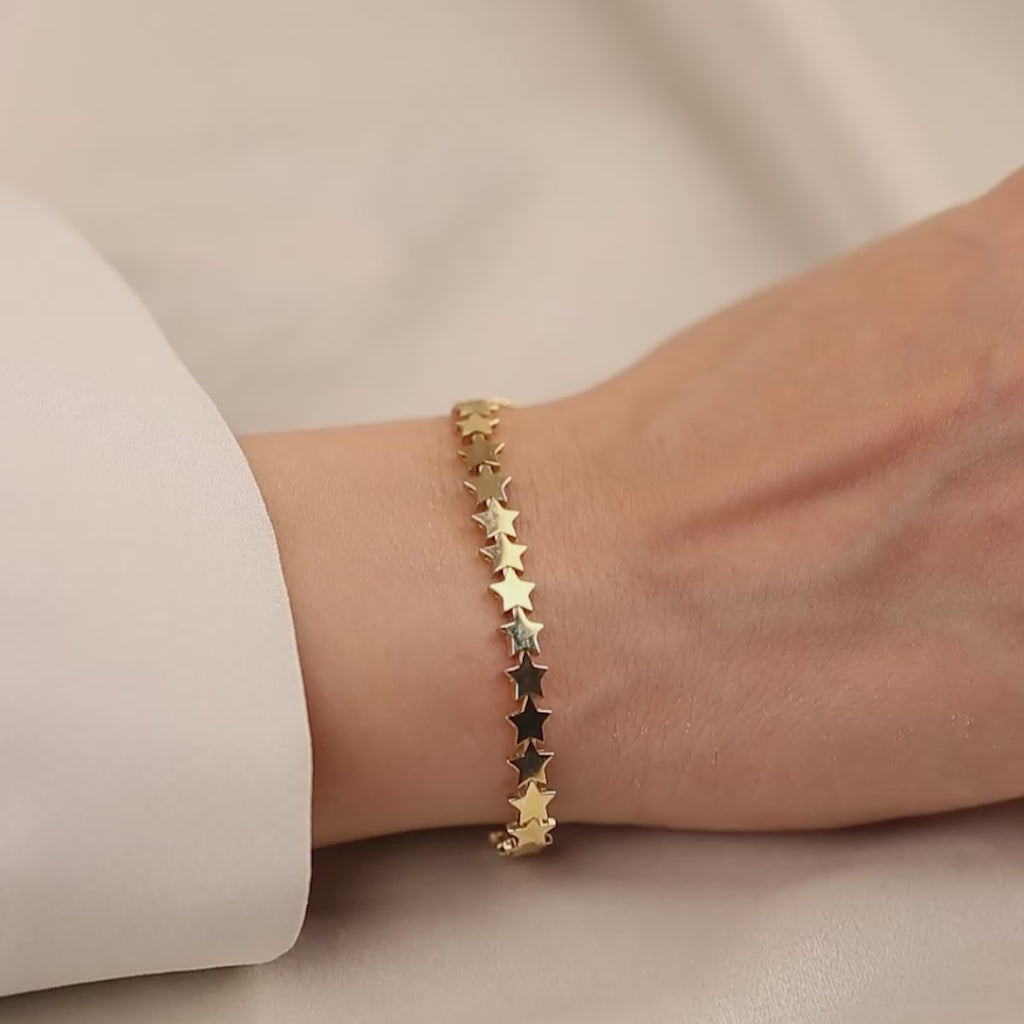 Yıldız detaylı 14 ayar altın bileklik, zarif tasarımı ve 6,95 gram ağırlığıyla şıklığı bileğinizde hissettiren özel bir aksesuardır. Modern ve minimal yıldız motifiyle hem günlük kullanımda hem de özel davetlerde stilinizi tamamlar. Nur Exclusive’in ustalıkla ürettiği bu zarif bileklik, dayanıklı yapısı ve estetik duruşuyla uzun yıllar severek kullanabileceğiniz bir parçadır.