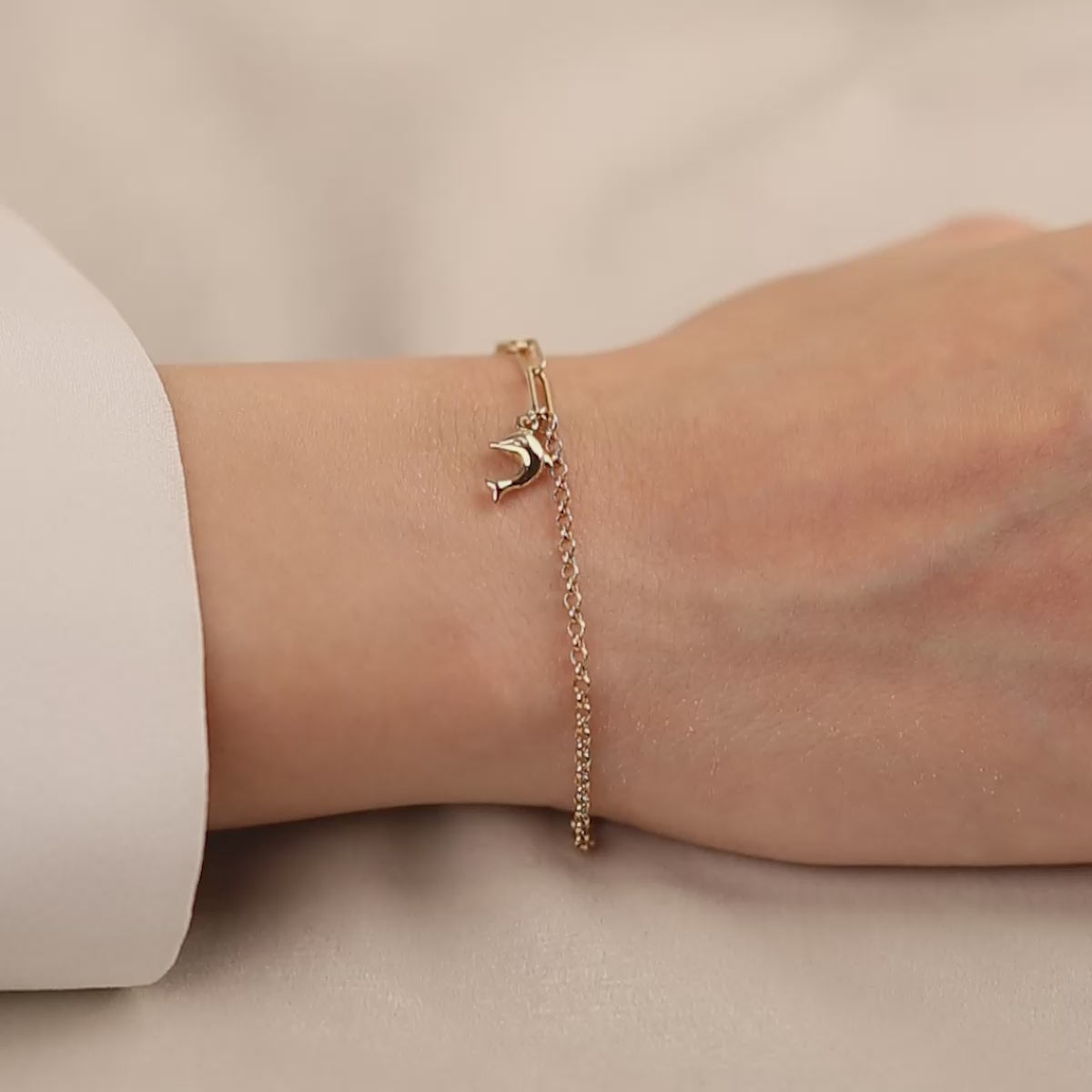 1,44 gram ağırlığındaki 14 ayar altın yunus balığı bileklik, zarif ve anlamlı bir tasarım sunar. İnce formu sayesinde günlük kullanımda hafif ve konforlu bir deneyim sağlar. Yunus balığı figürü, şansı, huzuru ve pozitif enerjiyi simgeleyen modern ve estetik bir detay olarak bileklikte öne çıkar.