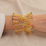 Nur Exclusive tasarımı bu özel tül model gül motifli 14 ayar altın kelepçe, zarif ve ince işçiliğiyle göz alıcı bir şıklık sunar. Hem günlük kullanım hem de özel gün kombinlerinde dikkat çeken bir parça olup, hafif tül dokusu ve romantik gül detayıyla modern & klasik tarzın mükemmel birleşimidir. Nur Kuyumculuk güvencesiyle üretilmiştir.